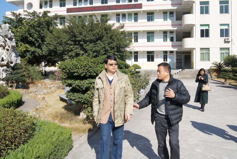 福建电大副校长陈展虹(左边)参观福鼎学院校园风光
