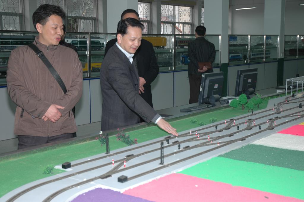 校长陈兴炎(左二)察看铁道运输实训场