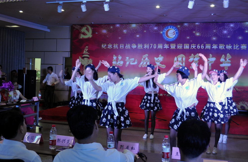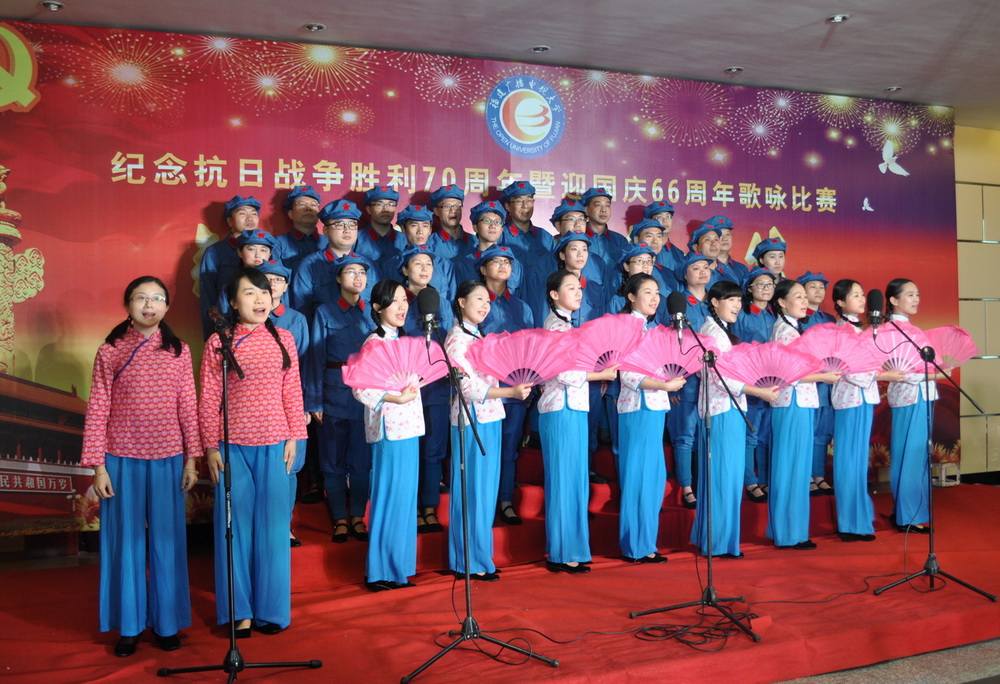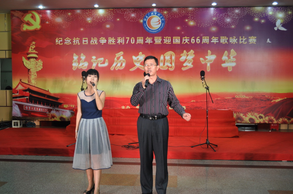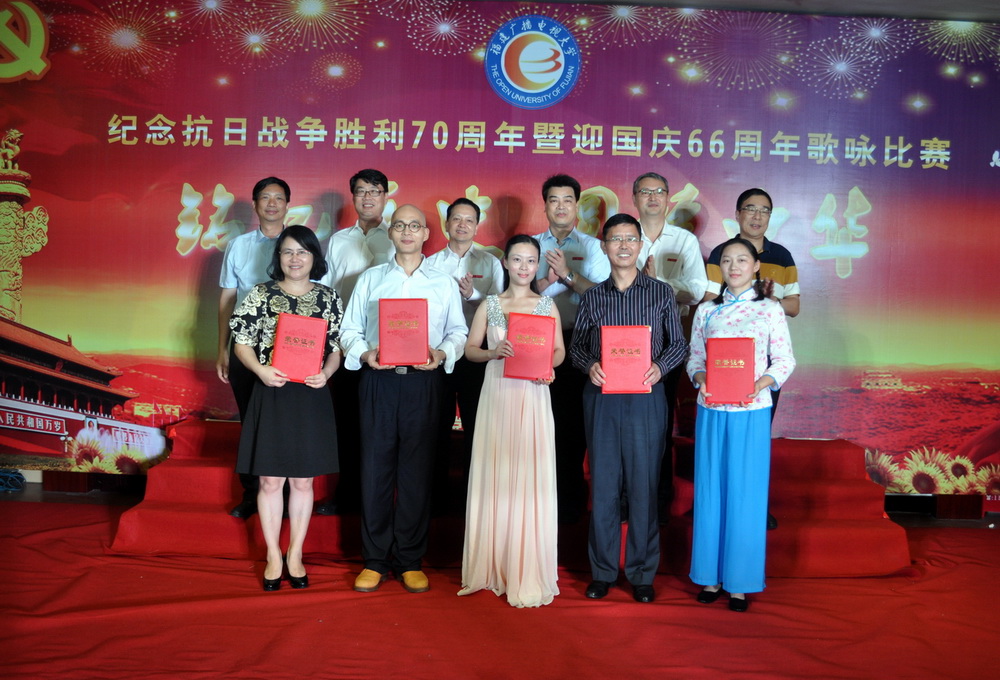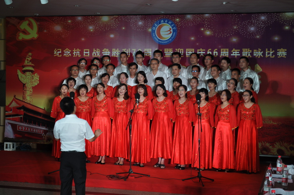 今年是中国人民抗日战争胜利70周年,也是新中国成立66周年,为弘扬伟大的抗战精神,唱响爱国主义旋律,让教职工从悲壮的历史中汲取革命先烈伟大的精神力量,传承以爱国主义为核心的民族精神,学校党委高度重视并专题部署系列纪念活动。9月29日下午,在左海校区多功能厅举行的大型歌咏比赛把纪念活动推向高潮。飞扬的歌声,吟唱难忘的岁月;熟悉的旋律,演绎激越的时代。以声传情的大合唱,回荡着中华民族当年的英雄浩叹。