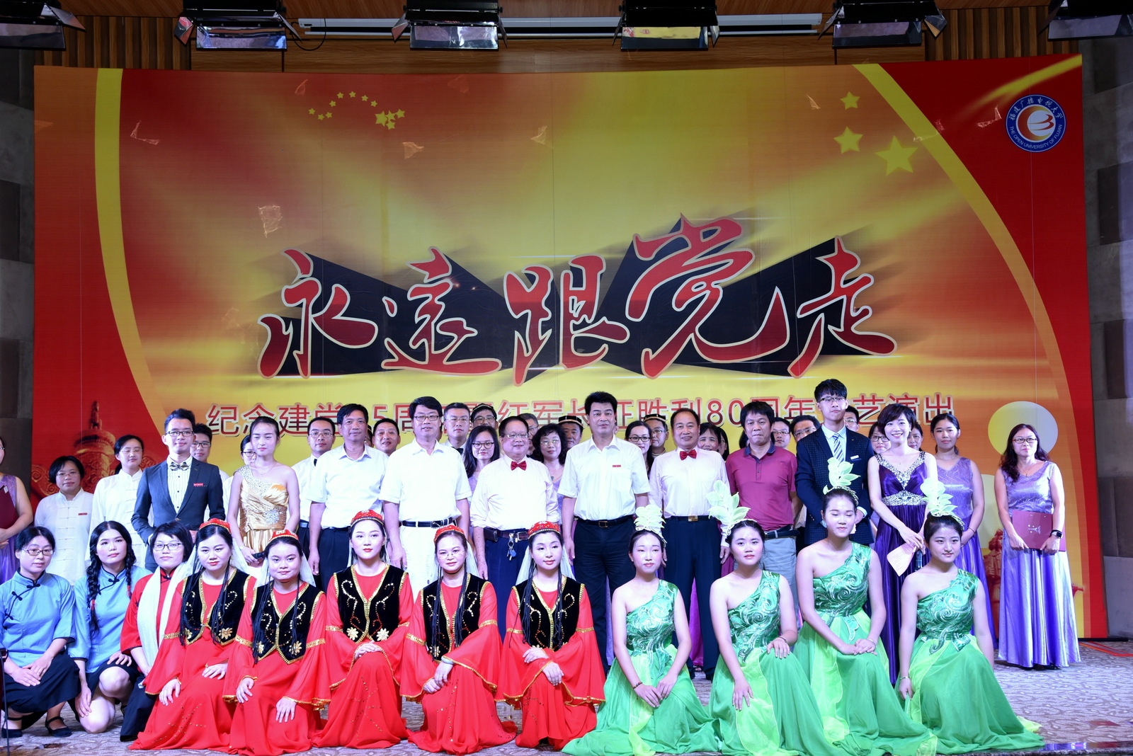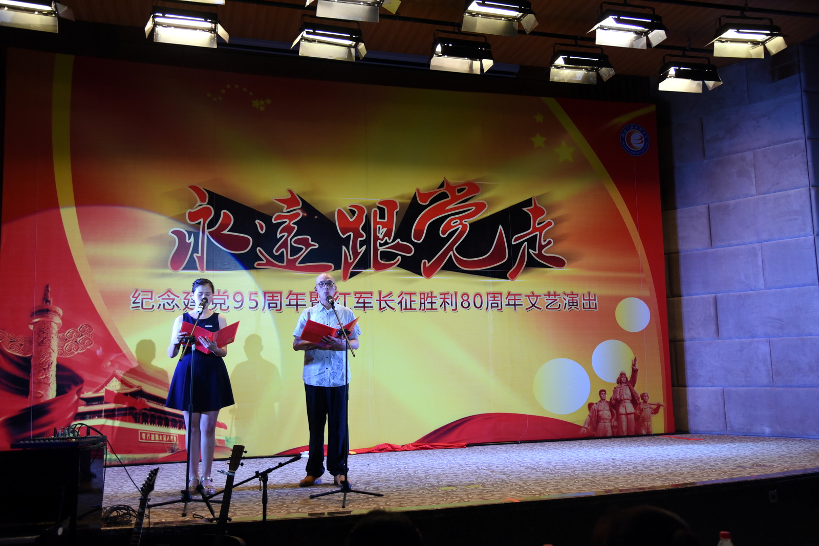 鲜红的党旗,来自星星之火;神圣的党徽,历经血雨腥风。为庆祝中国共产党成立95周年,学校在桂山校区隆重举行“永远跟党走”庆祝建党95周年暨长征胜利80周年文艺演出。校领导马国防、吴国荣、陈展虹、王幼新,各部门负责人,优秀党员、优秀党务工作者代表,以及教职工和学生代表共计200人观看了演出。